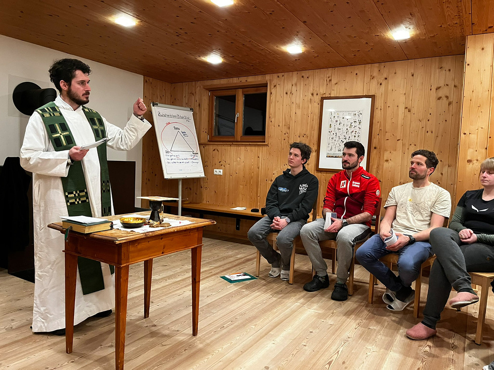 Ein besonderer Moment war die gemeinsame Messe mit Gabriel Steiner. Nach den Abenteuern zwischen Fels und Tiefschnee griff das Tagesevangelium mit der Bergpredigt die Erlebnisse der Tage auf. Besonders eindrücklich blieb die Seligpreisung „Selig die Sanftmütigen“. Sanftmut ist keine Schwäche, sondern eine Haltung des Vertrauens. Gerade am Berg wird sichtbar, wie wichtig es ist, sich aufeinander verlassen zu können, Mut zu zeigen, sich führen zu lassen, Verantwortung füreinander zu übernehmen, aber auch die eigenen Grenzen wahrzunehmen und zu respektieren. Diese Erfahrungen wurden im Tiefschnee immer wieder spürbar.