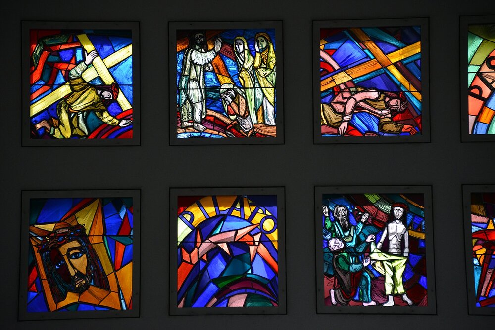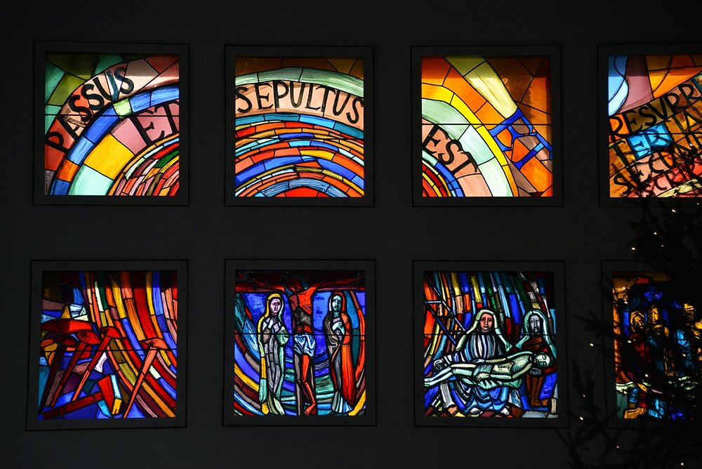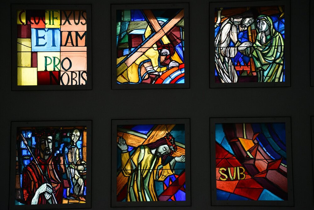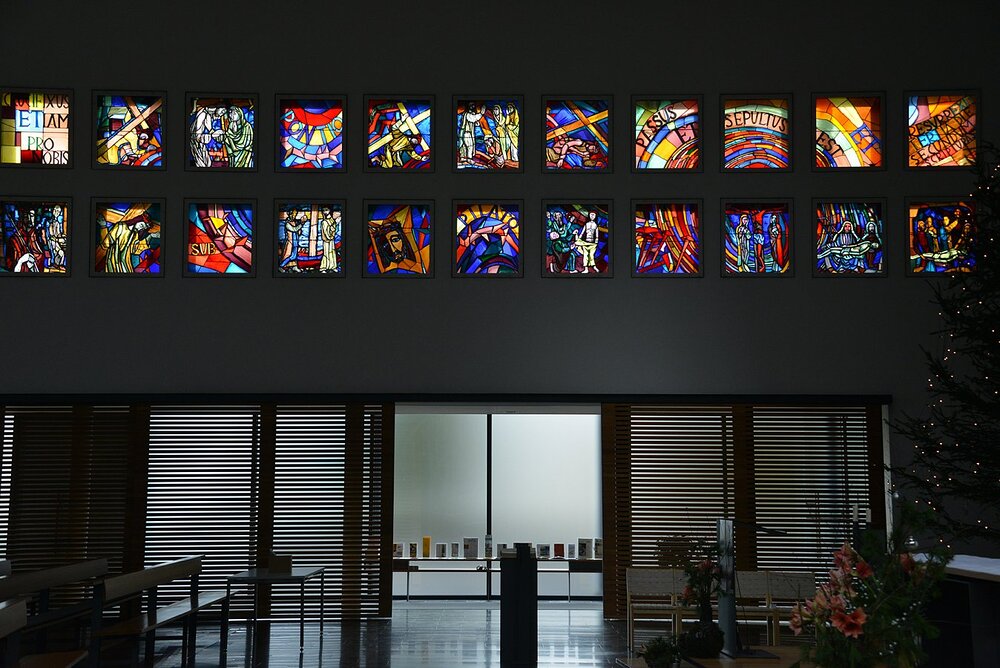 An der li. Langhauswand: Kreuzweg in 22 Glasfenstern in Doppelreihe.